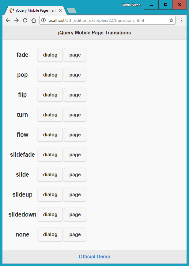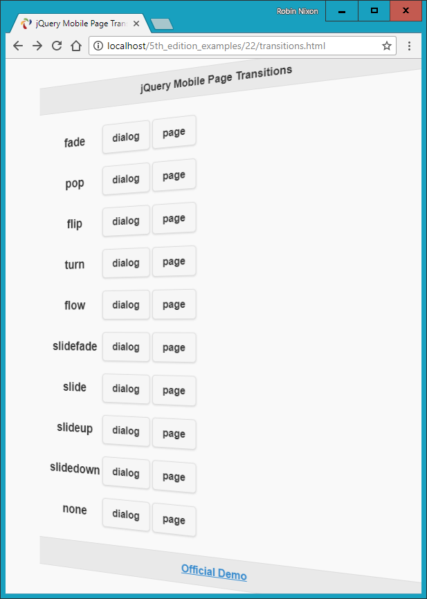 Example 22-2 demonstrates how to apply the various page transitions to both page loads and dialogs, loading the jQuery libraries locally rather than via a CDN. It consists of a bare-bones table with two columns, the first for loading a dialog and the other for loading a new page. Each of the available transition types is listed. To display the links as buttons, I’ve supplied the data-role attribute of each a value of button (buttons are covered in “Styling Buttons”).