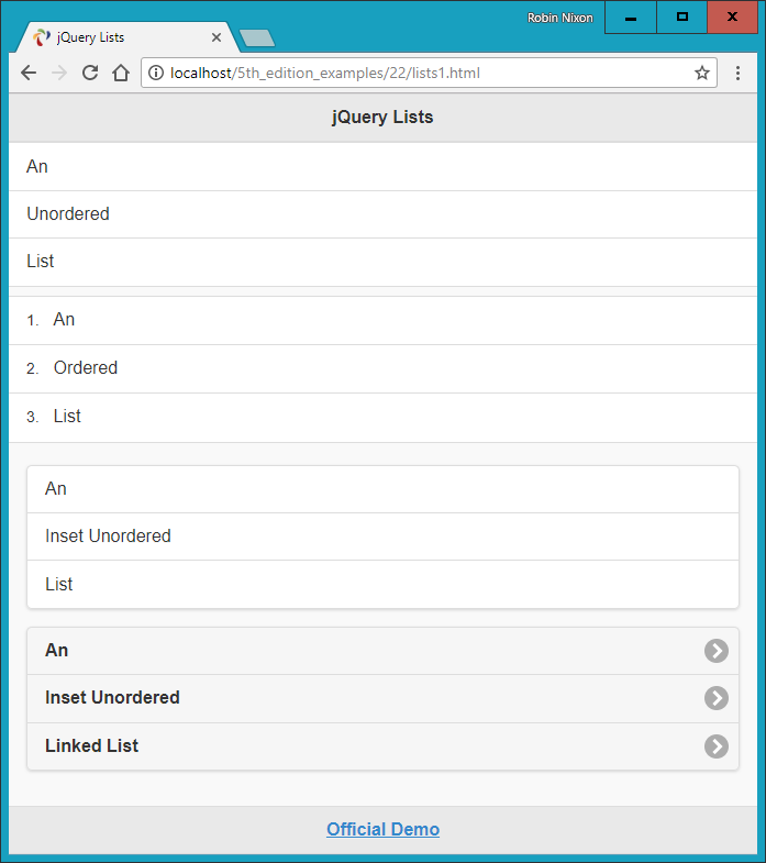 Once you’ve got the hang of everything in this chapter, if you would like to see what else jQuery Mobile can do for you, I recommend you check out the official demos and documentation on the website.