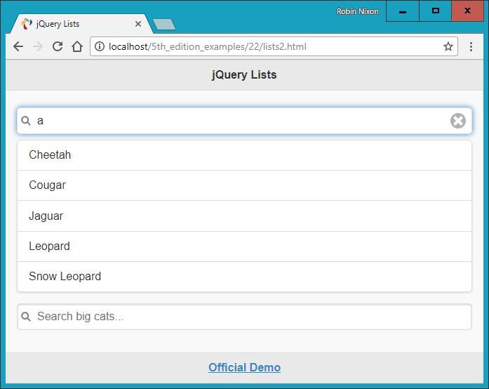 <ul data-role="listview" data-filter="true" data-filter-placeholder="Search big cats..." data-inset="true"> <li>Cheetah</li> <li>Cougar</li> <li>Jaguar</li> <li>Leopard</li> <li>Lion</li> <li>Snow Leopard</li> <li>Tiger</li> </ul> <ul data-role="listview" data-filter="true" data-filter-reveal="true" data-filter-placeholder="Search big cats..." data-inset="true"> <li>Cheetah</li> <li>Cougar</li> <li>Jaguar</li> <li>Leopard</li> <li>Lion</li> <li>Snow Leopard</li> <li>Tiger</li> </ul>