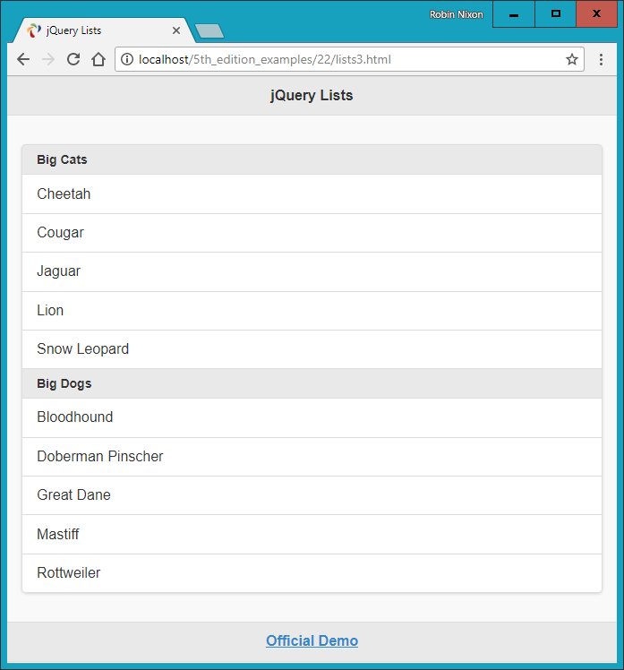 To ensure you can use these examples when offline, I have downloaded all the required jQuery files and included them along with the archive of example files, which you may freely download from the book’s companion website. Therefore, all these examples show the files being served locally.