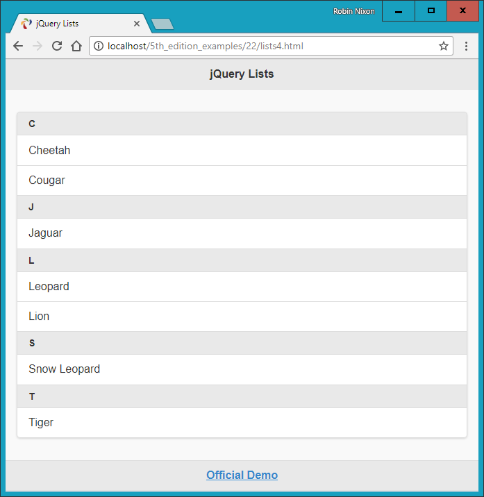 <ul data-role="listview" data-inset="true" data-autodividers="true"> <li>Cheetah</li> <li>Cougar</li> <li>Jaguar</li> <li>Leopard</li> <li>Lion</li> <li>Snow Leopard</li> <li>Tiger</li> </ul>