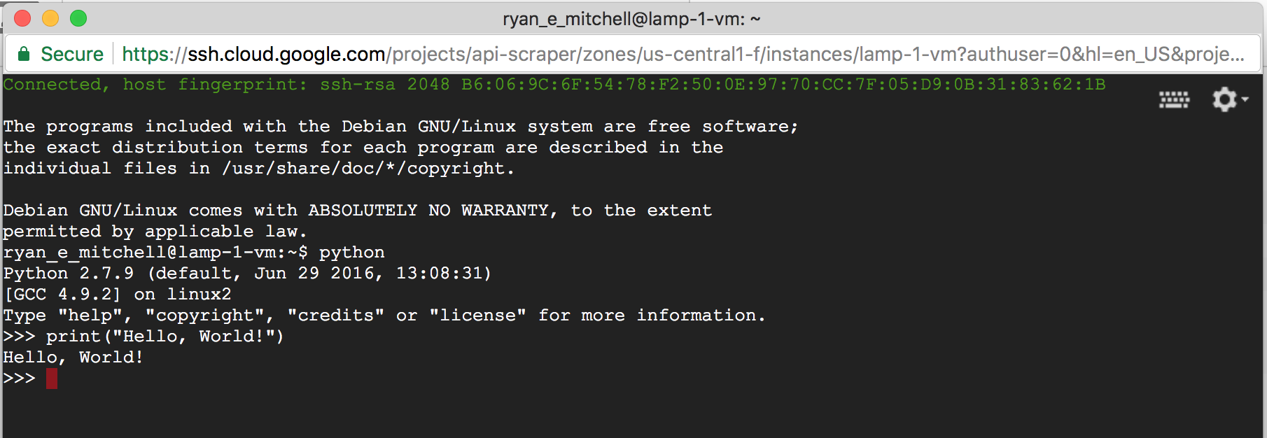 To run this, you can use the iPython notebook for Chapter 1 in the GitHub repository, or you can save it locally as scrapetest.py and run it in your terminal by using this command: