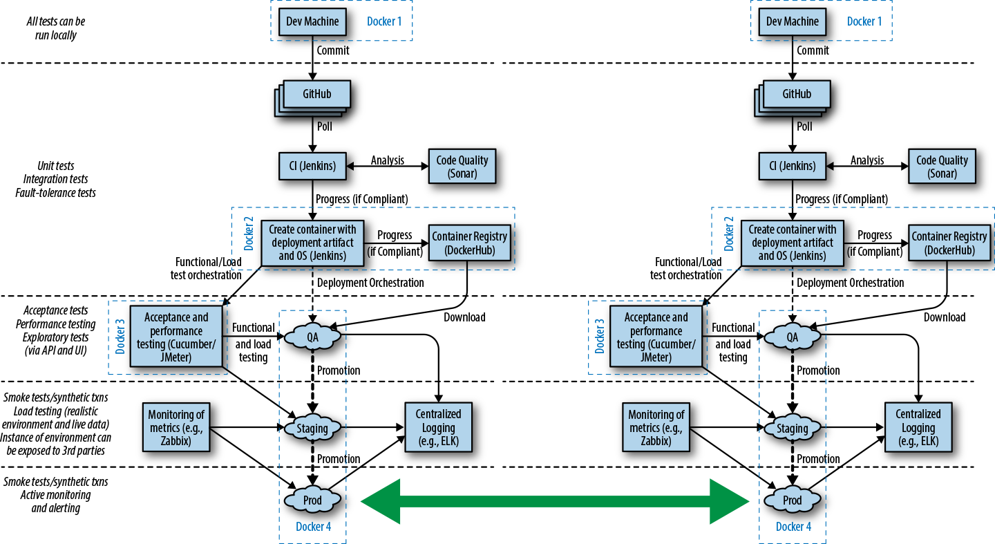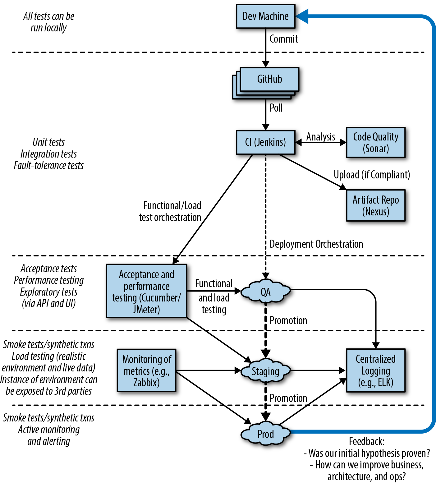 Figure 1-1 demonstrates a typical continuous delivery build pipeline for a Java-based application. The first step of the process of CD is continuous integration (CI). Code that is created on a developer’s laptop is continually committed (integrated) into a shared version-control repository, and is automatically built and packaged into an artifact. After CI, the resulting artifact is submitted to a series of automated acceptance and system quality attribute verification stages, before undergoing manual user acceptance testing and promotion through progressively more production-like environments.
