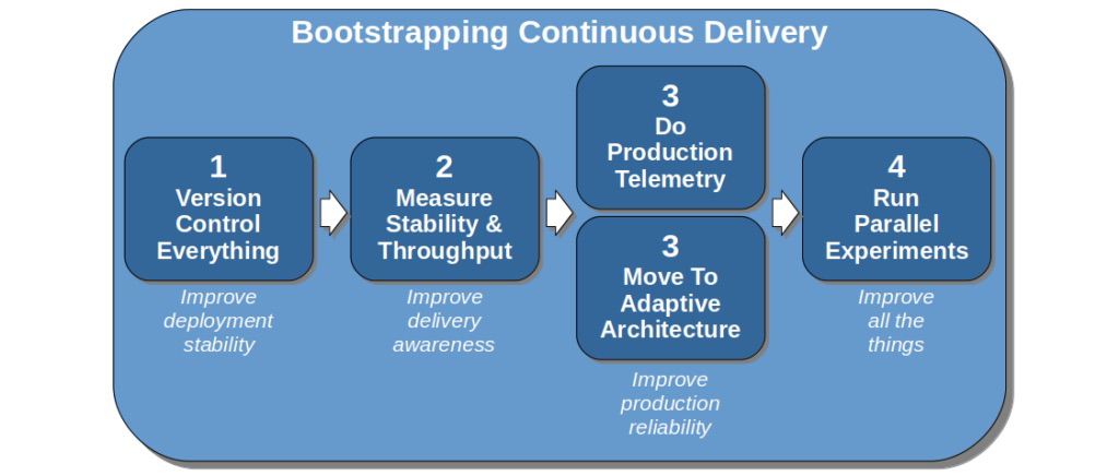 Steve Smith’s model for bootstrapping continuous delivery consists of: version controlling everything; measuring stability and throughput; adding production telemetry and moving to an adaptive architecture; and running parallel experiments.