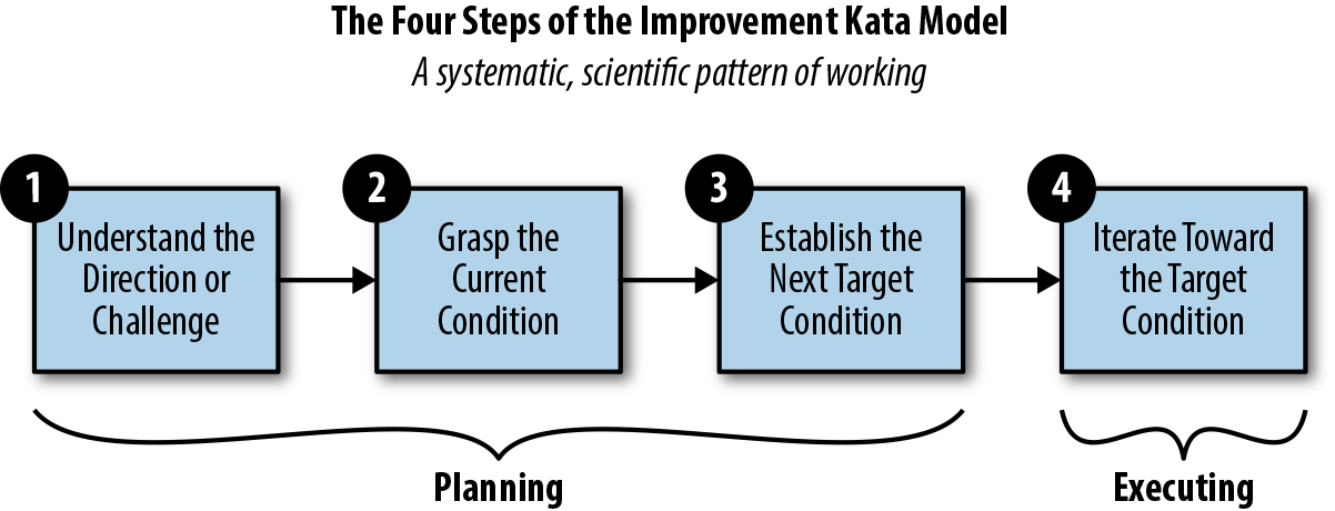 It is key to first understand your challenges. Perhaps you are frequently slowed by failed releases, or you don’t get appropriate requirements from the business. You must then grasp the current condition fully, and work with people across the organization and share responsibility for the potential improvements. After establishing the next target condition and planning with your team, you iterate toward this goal. Along the way, monitor for signs of success and failure, and continually reflect on and feed your learning forward into the process.