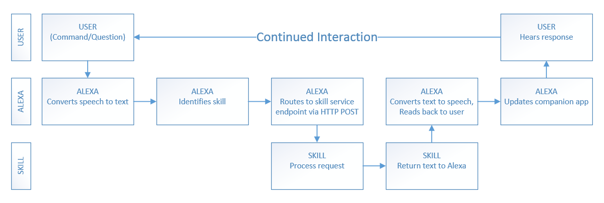 It begins with you asking Alexa to do something, via your device. The Echo transmits your command to the Alexa Voice Service via the internet. Alexa Voice Service converts the speech to text, parses it, identifies the skill being requested and routes the request to the skill service endpoint. (This could be in AWS Lambda, Azure, or a service you host.)