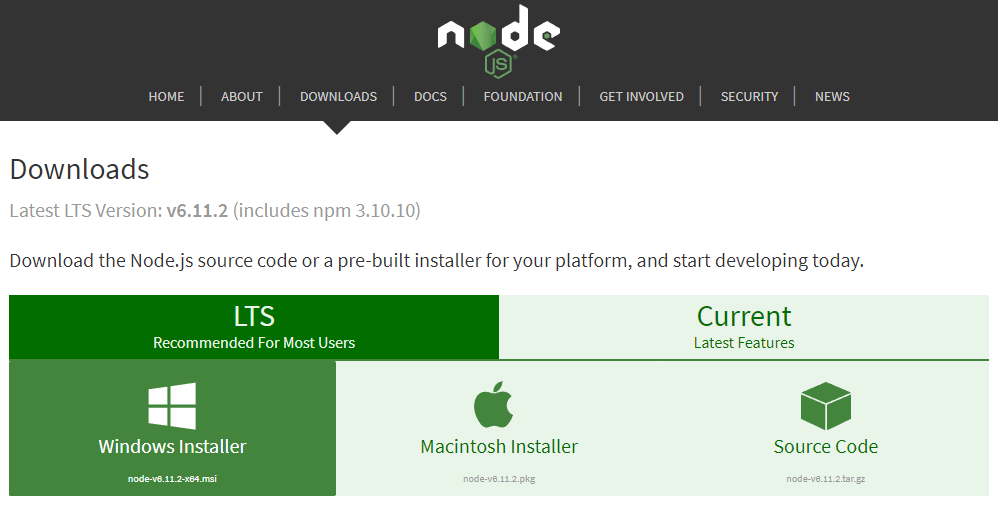 Optionally, you may want to download and install Node.js. We won’t use it exclusively throughout the book, but we will be referencing the Node.js Alexa Skills Kit Samples in a later chapter. You can find the latest stable Node.js release here: https://nodejs.org/en/download/ as shown in Figure 1-3.