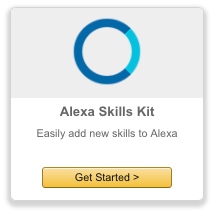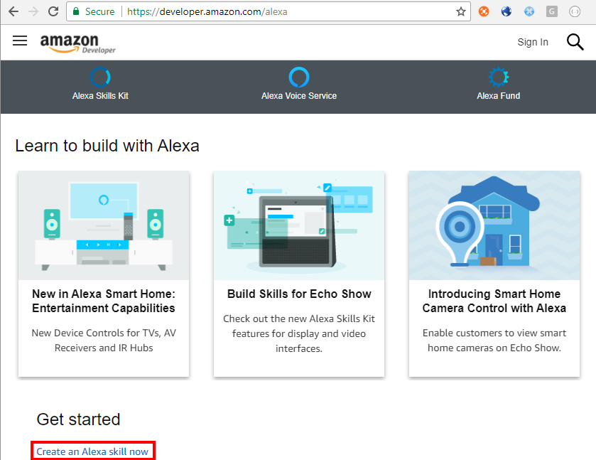 Once you’ve signed in, make sure you’re in the Alexa section, and click the Get Started button under the ASK logo, as shown in Figure 1-5. If you don’t see it, try clicking the Alexa tab in the menu bar near the top of the page. Amazon has a tendency to move things around, but you should be able to spot a “Get Started” button or link somewhere on the page.