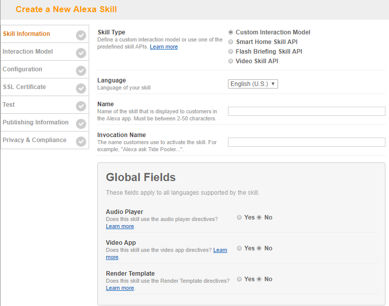 For this skill, I am sticking with the default choices of Custom Interaction Model and English (U.S.) language. For the Name and Invocation fields, just call it “Hello World”. Take the defaults in the Global Fields section, and click the Save button.