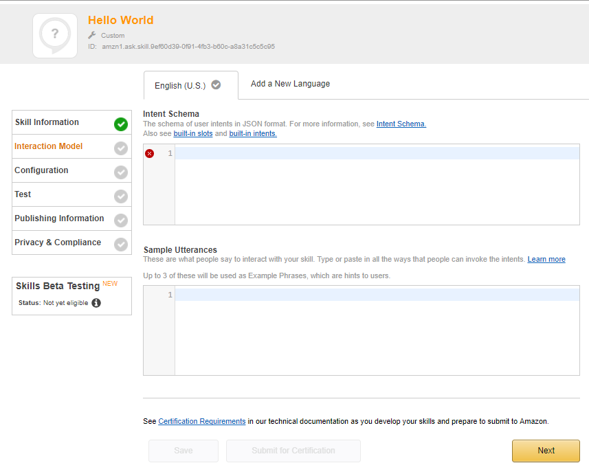 At this point, the Save button will go away, and a Next button will appear. Before you click it, take a look at the page again and you’ll see the addition of an Application ID field. This is unique to your skill, and you can’t edit it.