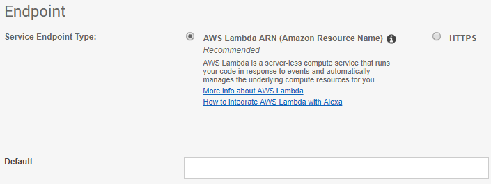 For this skill, you will just take all the defaults, except for the Endpoint Type, as seen in Figure 1-8. Select the AWS Lambda option. We’ll discuss both option in further detail in a later chapter, but for now, we’re going to use AWS Lambda. (AWS stands for Amazon Web Services, in case you were wondering.)