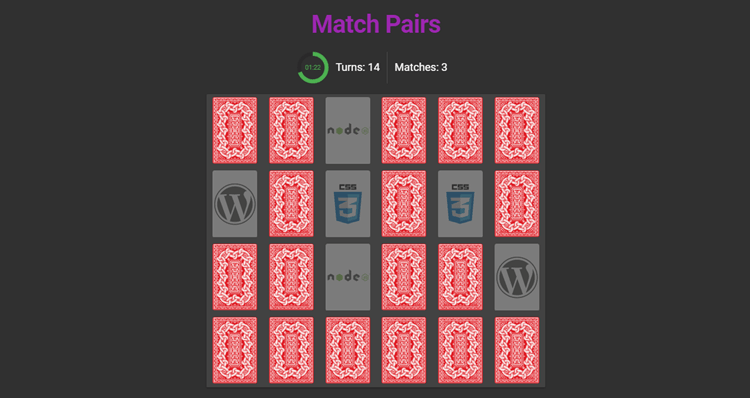 First, if we click on a flipped or found card, the function will terminate. If started is false, it will start the game. Next, when we open the first card, it will change its flipped prop to true. When we open the second card, it will change its flipped prop to true and will increase the turns prop. Next, if the cards are the same, it will increase the matches prop and set a flipBackTimer. It will wait one second and will set the cards found props to true, and will clear the flipped cards. If all cards are found, the game will finish. If the two opened cards are not same, it will just clear the flipped cards.