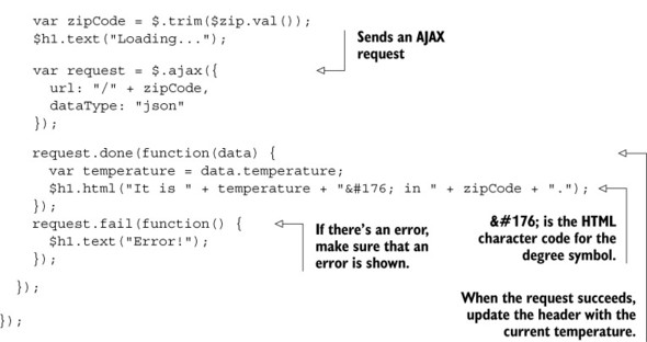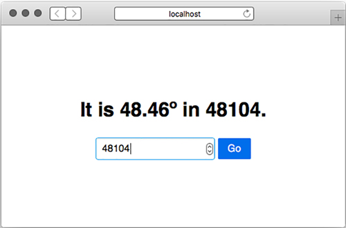 With that, you can start the application with npm start. Visit http://localhost:3000, type in a ZIP Code, and watch the temperature appear, as shown in figure 5.1.