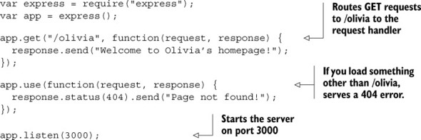 Let’s say you want to write a simple Express application that responds to the previous HTTP request (an HTTP GET to /olivia). You’ll call methods on your Express app, as shown in the following listing.