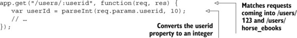 This is one way to enforce the “the user ID must be an integer” constraint. Like the previous example, it’s passed in as a string, so you have to convert it to a number (and probably to a user object farther down the line).