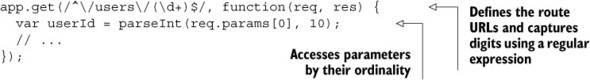 Let’s imagine that you want to match things like /users/123 or /users/456 but not /users/olivia. You can code this into a regular expression and grab the number to boot, as shown in the next listing.