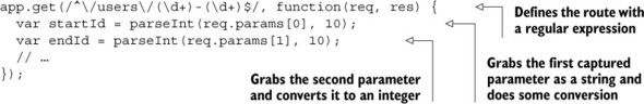 Regular expressions can be a little difficult to read, but you can use them to define much more complex routes than these. You might want, for example, to define a route that looks for ranges; that is, if you visit /users/100-500, you can see a list of users from IDs 100 to 500. Regular expressions make this relatively easy to express (no pun intended), as shown here.