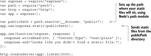 We’ve sent static files with middleware before, but don’t roll your eyes yet—we’re going to dive just a little deeper. We went over this in chapter 2, so I won’t preach the benefits of this stuff. The following listing is a review of the code example we used in chapter 2.