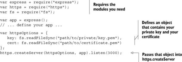 Once you have a certificate, you can use Node’s built-in HTTPS module with Express, as shown in the following listing. It’s very similar to the HTTP module, but you’ll have to supply your certificate and private key.