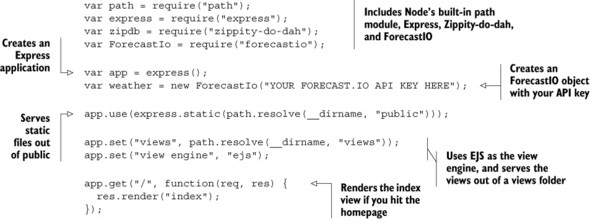 For this application, you’ll use four Node packages: Express (obviously), ForecastIO (for grabbing weather data from the free API called Forecast.io), Zippity-do-dah (for turning ZIP Codes into latitude/longitude pairs), and EJS (for rendering HTML views). (These are some pretty good names, right? Especially Zippity-do-dah.)