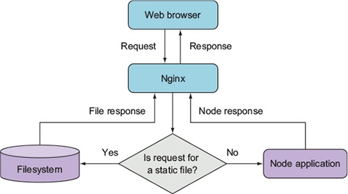 Fortunately, Nginx (http://nginx.org/en/), an open source web server optimized for serving static files, is easy to set up alongside Node to serve those files. In a typical Nginx/Node configuration, Nginx initially handles each web request, relaying requests that aren’t for static files back to Node. Figure 10.3 illustrates this configuration.
