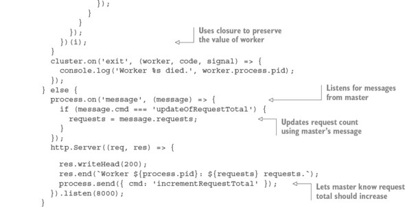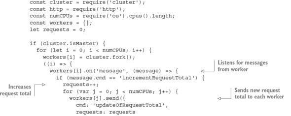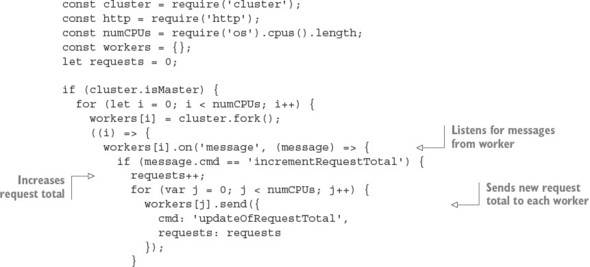 The following listing shows an example in which messages are passed between the master and the workers. A count of all requests is kept by the master, and whenever a worker reports handling a request, it’s relayed to each worker.