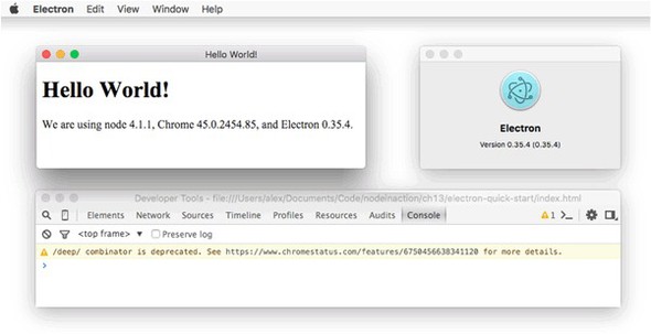 When the application starts, you should see a window with a web page and the Chromium Developer Tools. If you’re a web developer who uses Chrome, this might not seem that exciting: the app looks like a web page with no CSS rendering in Chrome. But a lot more is going on under the hood to make this work. Figure 12.3 shows what this looks like in macOS.