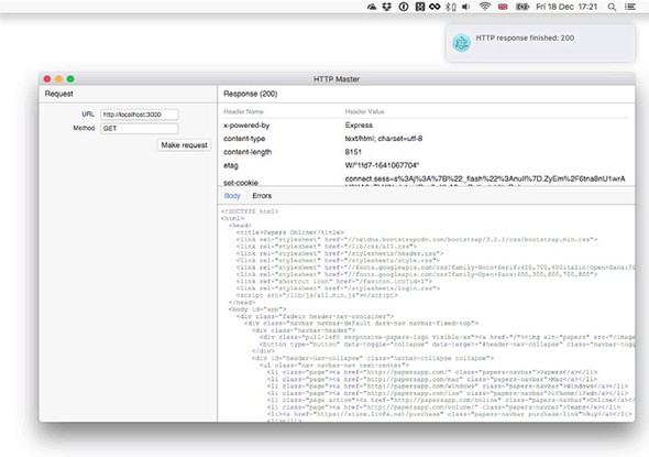 Now that you’ve seen how to create a basic Electron app and how to use Node modules, let’s go a step further and see how to build a fully fledged desktop app with native features. The application you’ll create is intended to be a developer tool for making and viewing HTTP requests. Think of it as a GUI for the request module (www.npmjs.com/package/request).