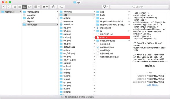 Notice that you can open the JavaScript files to view the source. The only binary files in an Electron application are resources such as images, or binary Node modules.