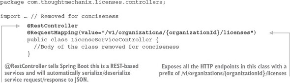 Listing 2.3. Marking the LicenseServiceController as a Spring RestController