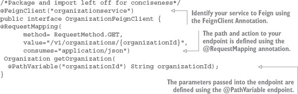 Listing 4.12. Defining a Feign interface for calling the organization service