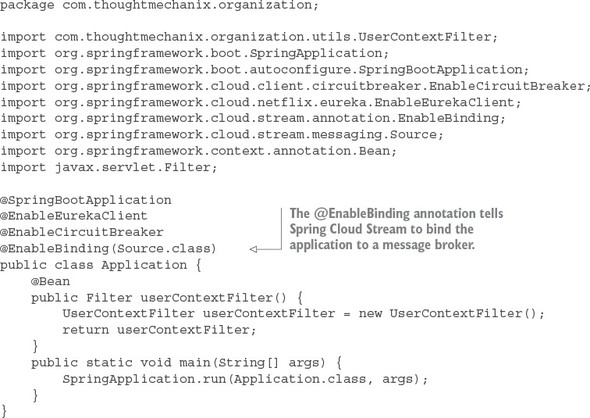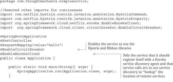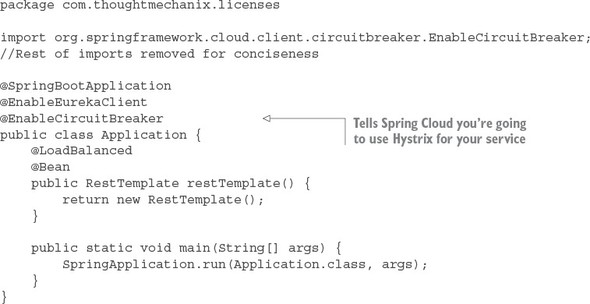 Listing 5.1. The @EnableCircuitBreaker annotation used to activate Hystrix in a service