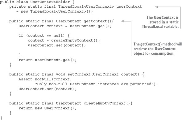 Listing 6.10. The UserContextHolder stores the UserContext in a ThreadLocal