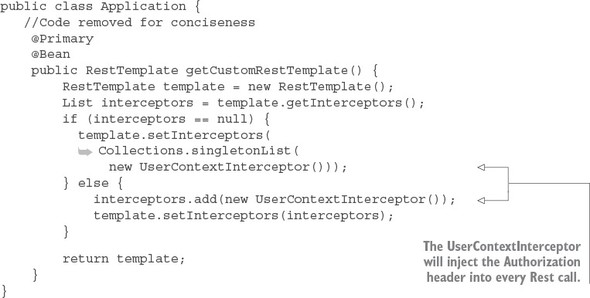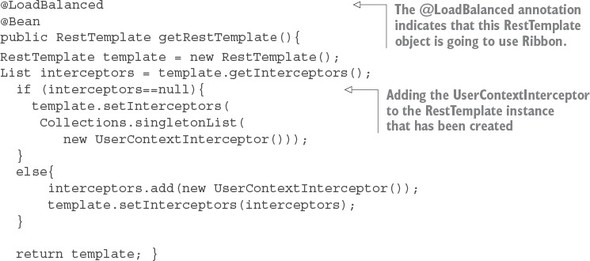 Listing 6.12. Adding the UserContextInterceptor to the RestTemplate class