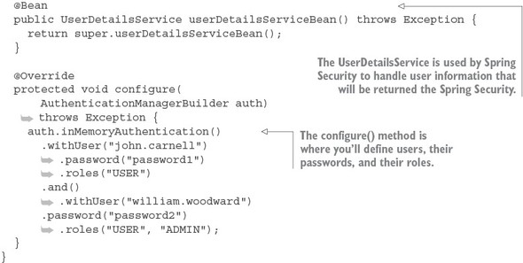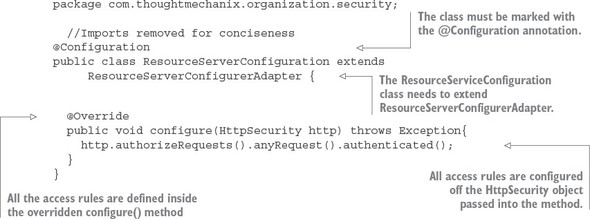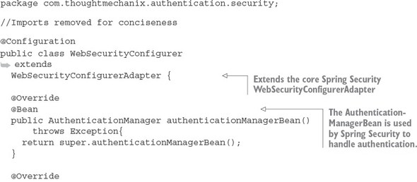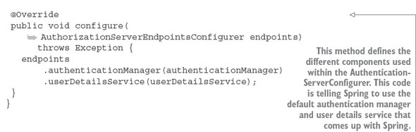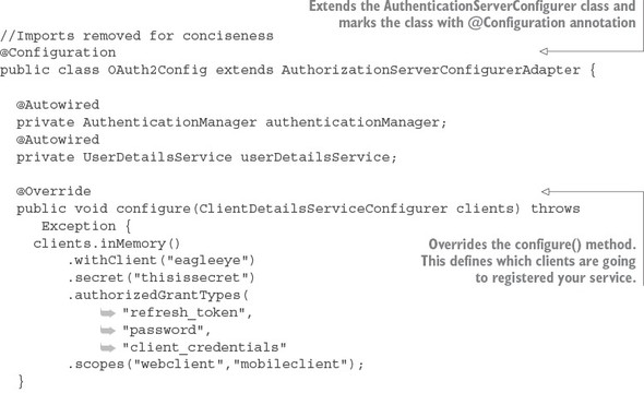 Listing 7.2. OAuth2Config service defines what applications can use your service