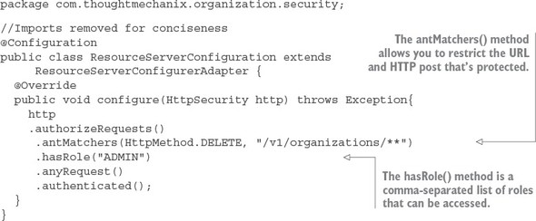 Listing 7.6. Restricting deletes to the ADMIN role only