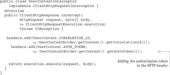 Listing 7.11. The UserContextInterceptor will inject the JWT token into your REST calls