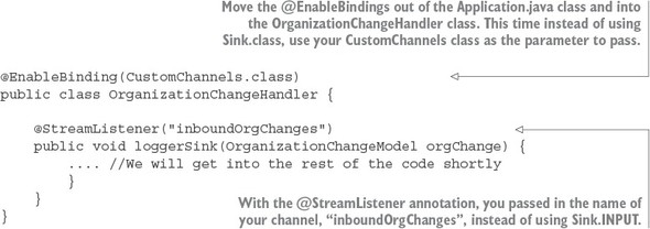 Listing 8.14. Using the new custom channel in the OrganizationChangeHandler