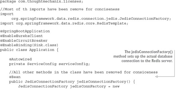Listing 8.8. Establishing how your licensing service will communicate with Redis