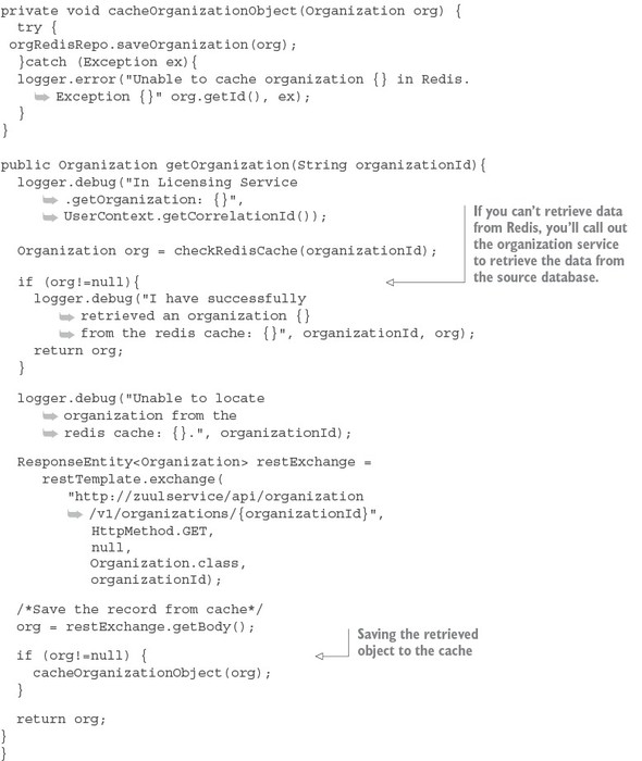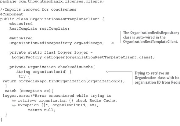 Listing 8.11. OrganizationRestTemplateClient class will implement cache logic