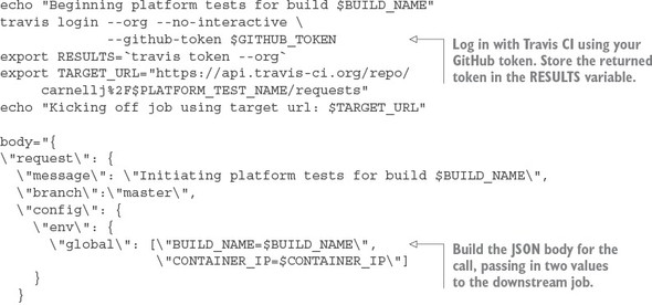 Listing 10.8. Kicking off the platform tests using Travis CI REST API