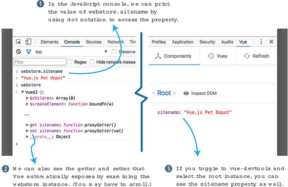 Listing 10.7. Updating the Vue.js instance: chapter-10/vuex-state-getter-action3.html