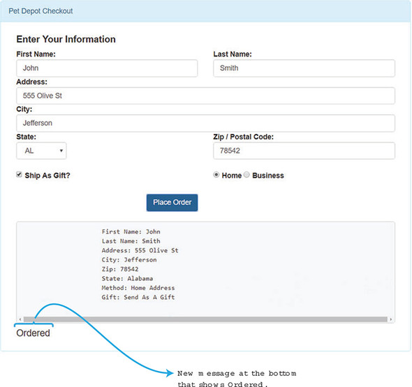 The order form will be updated so it shows a message at the bottom that the order is complete (figure 12.1). When madeOrder is true, the text will appear. When it’s false, the text will not show up. We add this so we can get a little more feedback when the order button is clicked, because we’re no longer going to use the alert box.