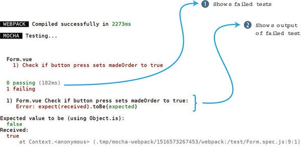 Because everything passed, a successful message is displayed. Let’s see what it looks like when it fails. Go back into the petstore/test/Form.spec.js file. Look for the expect statement and set the value to false instead of true. Run the command npm test again and it should fail. Notice from figure 12.3 that the expected value and the received value are displayed in the output.