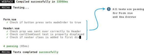 The last thing we do is check that the wrapper.vm.cartItemCount matches the cartItemCount variable. If they’re the same, the test passes. Take the code in the next listing and copy it to the petstore/test/Header.spec.js file.