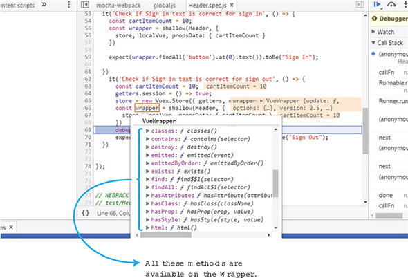 After the debugger starts, it will stop at the place in our code where we added the debugger statement. From here, we can view the console, and look at variables, as you can see in figure 12.7. For example, if you click the wrapper, then __proto__, and then __proto__ again, you’ll see all the wrapper methods.