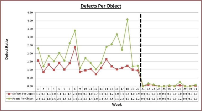 Figure 1. Defects per Object Before and After Data Modeling Adopted. Courtesy of Ron Huizenga.