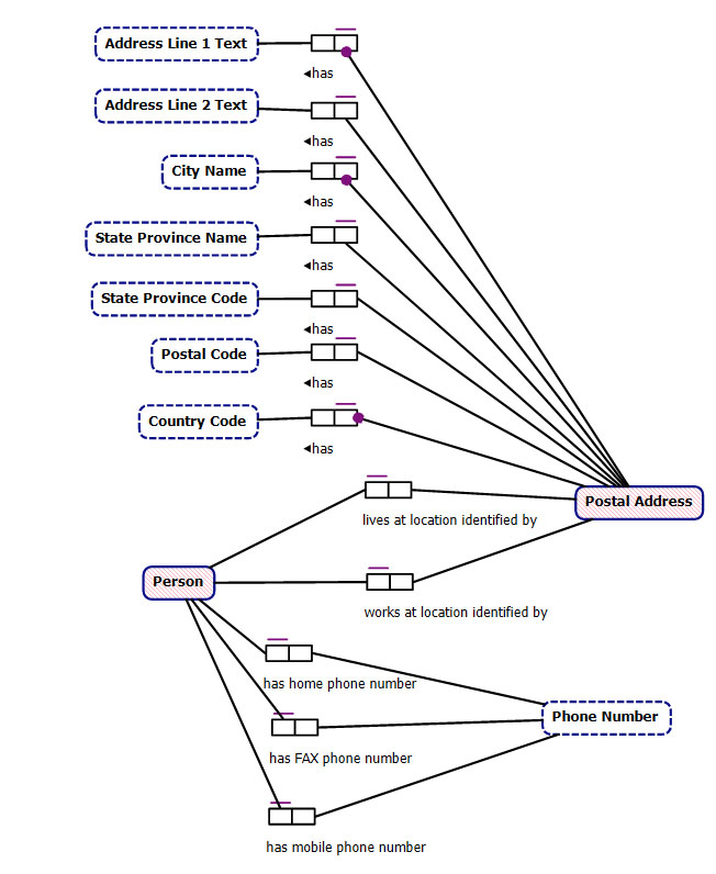 A distinct advantage of fact-based modeling is that it is relatively straightforward to verbalize relationships in natural language; so straightforward, in fact, that modeling tools can do it. This is a wonderful tool for confirming that the model expresses the intended semantics. For example, the relationship from Person to Postal Address via “works at location identified by” is verbalized by the NORMA tool as follows: