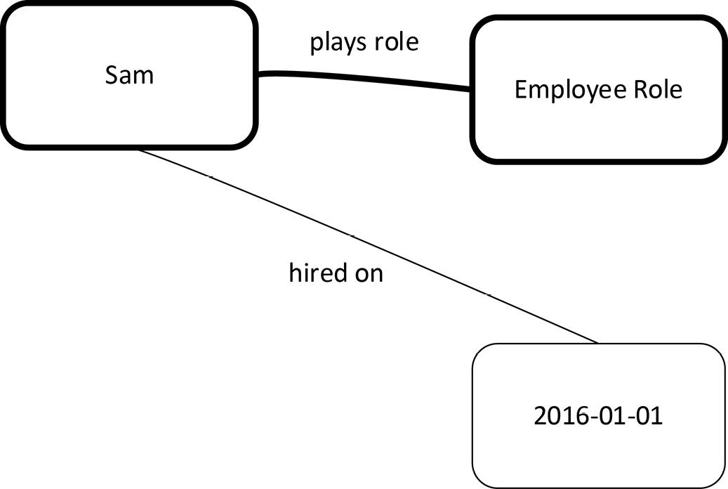 A graph DBMS supports the organization of data into a graph. There are only two kinds of model entities in a graph: nodes and edges. Graph data is usually drawn using ellipses or rectangles to represent nodes and lines or arcs to represent edges. In contrast to common practice in most applications of data modeling, graph data models usually depict entity instances rather than entity types. Figure 17-1 shows some graph data expressed using the COMN symbols for real-world objects (Sam), simple real-world concepts (Employee Role), and data values (2016-01-01).