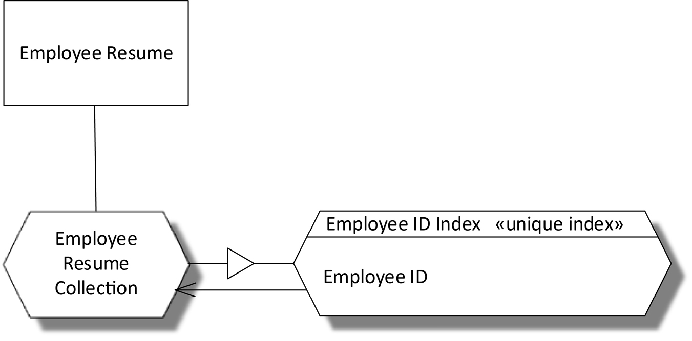 As with any database, speedy access to data will depend on important components being indexed. A database index is built and maintained by a DBMS by taking a copy of the values (or states) of all instances of a specified component or components, and recording in which documents those values are found. This is represented in COMN as a projection of data from the record or document collection to the index, and then a pointer back to the collection. DBMSs usually offer indexes in many styles. The particular index style can be indicated in the title bar of the index collection, in guillemets, as in «range index». This notation gives the class (or type) from which the current symbol inherits or is instantiated. See Figure 17-3 for an example. The Employee ID Index is defined as a physical record collection that is a projection from the full Employee Resume Collection of just the Employee ID component. The index is also an instance of a unique index, a class supported by the DBMS. The pointer back to the collection is implicitly indicating a one-to-one relationship from each index record to a document in the collection, which is true of a unique index. A non-unique index would require a “+” at the collection end of the arrow, indicating that one index record could indicate multiple documents or records in the collection.